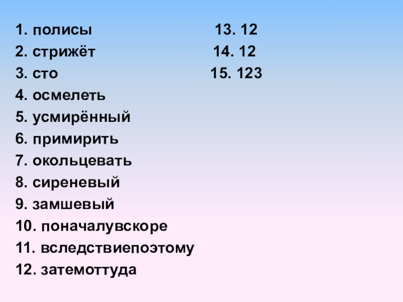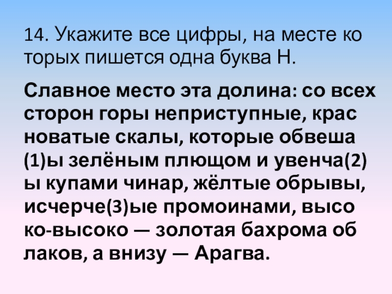 Слайд 1414. Укажите все цифры, на месте которых пишется одна буква Н.