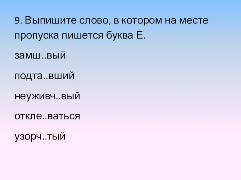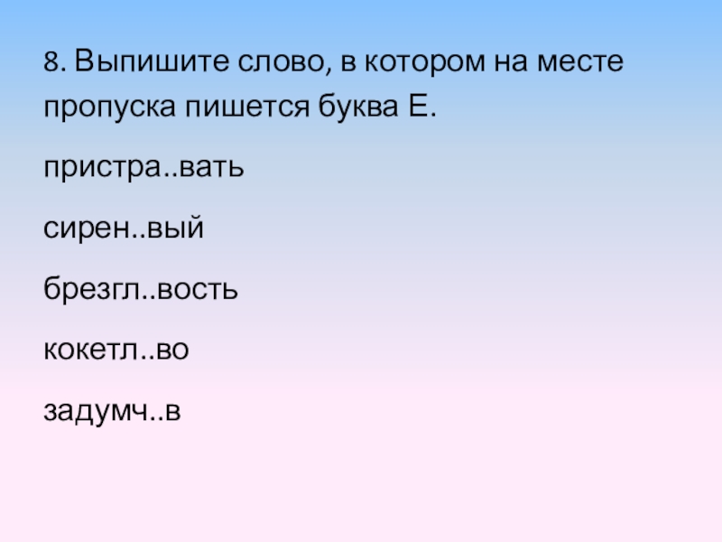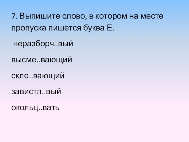 Слайд 99. Выпишите слово, в котором на месте пропуска пишется буква Е.