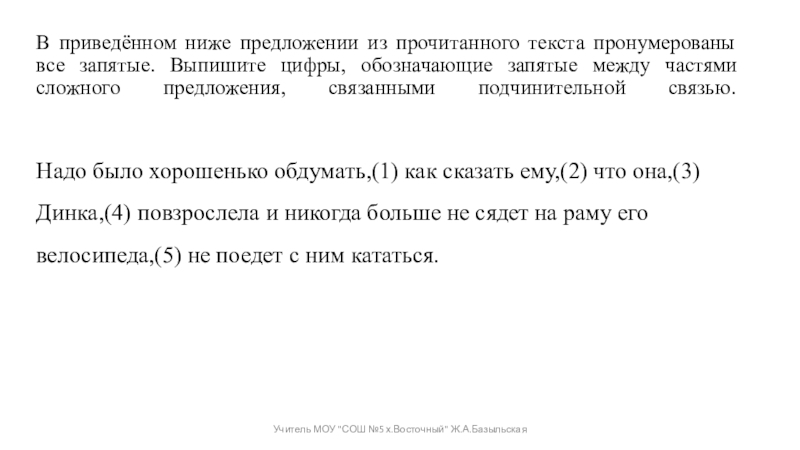 Надо было хорошенько обдумать,(1) как сказать ему,(2) что она,(3) Динка,(4) повзрослела и никогда больше не сядет на раму его велосипеда,(5) не поедет с ним кататься.