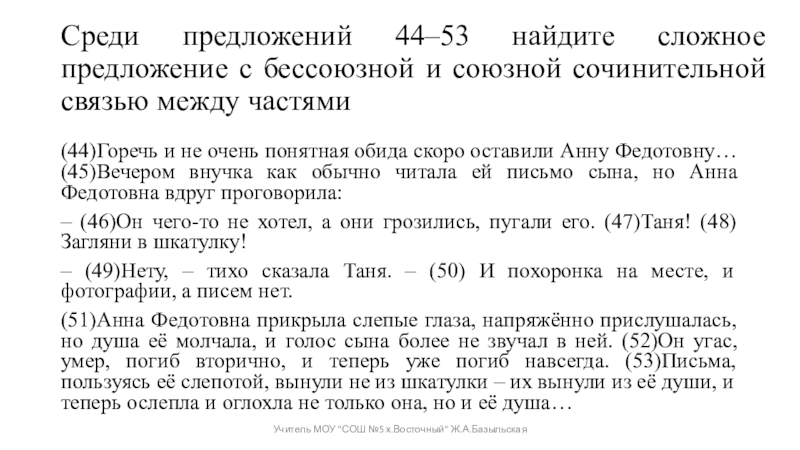(44)Горечь и не очень понятная обида скоро оставили Анну Федотовну… (45)Вечером внучка как обычно читала ей письмо сына, но Анна Федотовна вдруг проговорила: