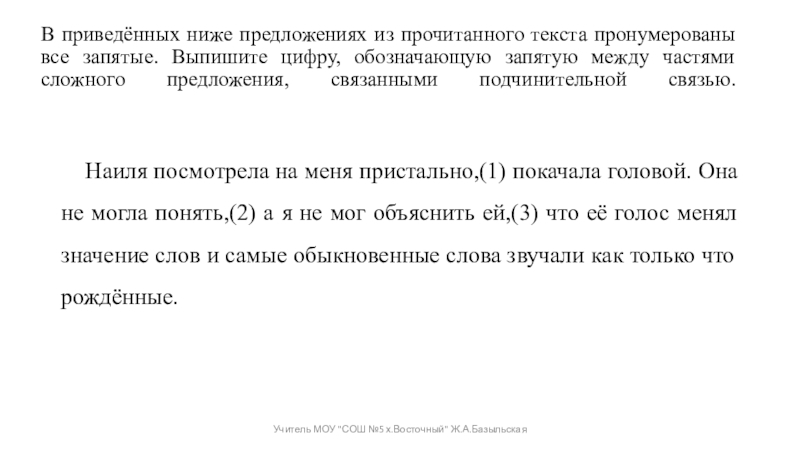 Наиля посмотрела на меня пристально,(1) покачала головой. Она не могла понять,(2) а я не мог объяснить ей,(3) что её голос менял значение слов и самые обыкновенные слова звучали как только что рождённые.