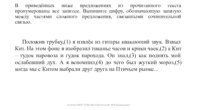 Положив трубку,(1) я извлёк из гитары квакающий звук. Взвыл Кит. На этом фоне я изобразил тиканье часов и крики чаек,(2) а Кит – гудок паровоза и гудок парохода. Он знал,(3) как поднять мой ослабевший дух. А я вспомнил,(4) до чего был жуткий мороз,(5) когда мы с Китом выбрали друг друга на Птичьем рынке...