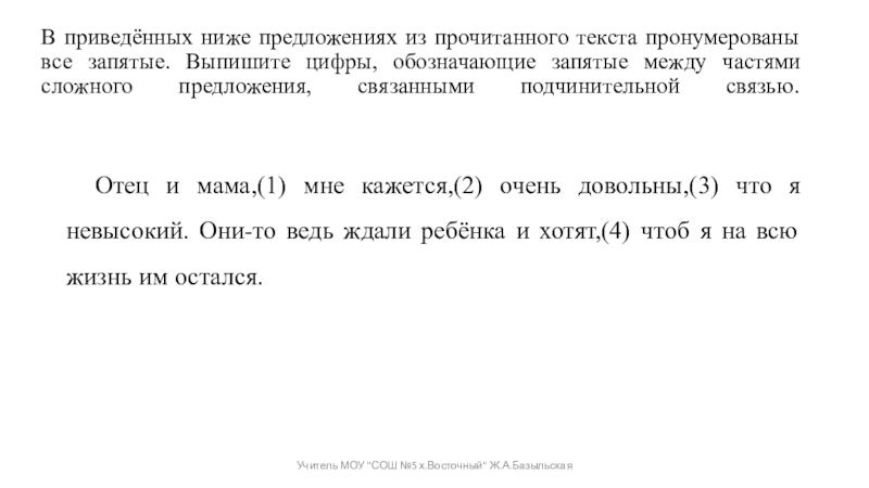 Отец и мама,(1) мне кажется,(2) очень довольны,(3) что я невысокий. Они-то ведь ждали ребёнка и хотят,(4) чтоб я на всю жизнь им остался.