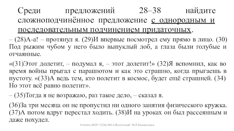 «(31)Этот долетит, – подумал я, – этот долетит!» (32)Я вспомнил, как во время войны прыгал с парашютом и как это страшно, когда прыгаешь в пустоту. «(33)А ведь тем, кто полетит в космос, будет ещё страшней. (34)Но этот всё равно полетит».