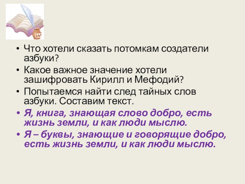 Слайд 34Что хотели сказать потомкам создатели азбуки?