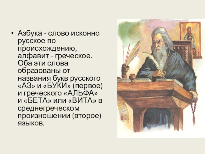 Слайд 4Азбука - слово исконно русское по происхождению, алфавит - греческое. Оба