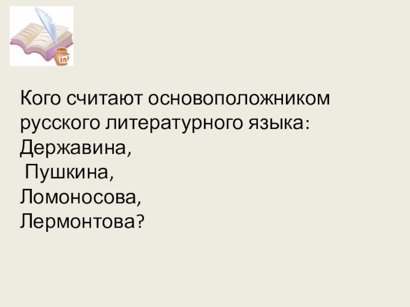 Слайд 40Кого считают основоположником русского литературного языка: Державина,
