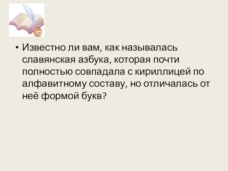 Слайд 14Известно ли вам, как называлась славянская азбука, которая почти полностью совпадала
