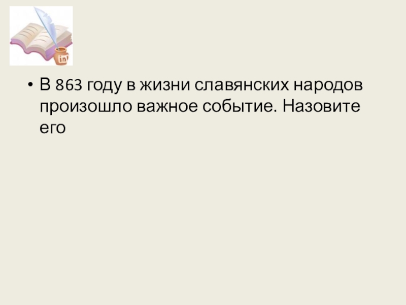 Слайд 27В 863 году в жизни славянских народов произошло важное событие. Назовите