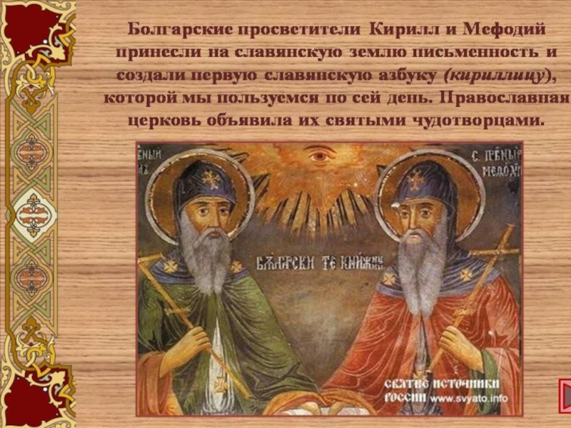письмо. Это известные во всех славянских странах получившие сан святых Кирилл и Мефодий. Именно они стали основоположниками славянской письменности.