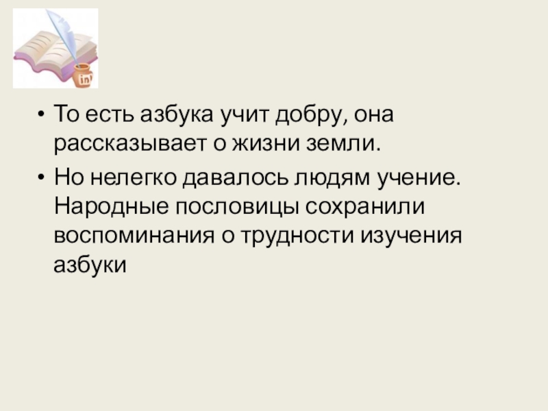 Слайд 35То есть азбука учит добру, она рассказывает о жизни земли.