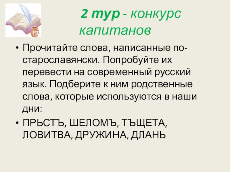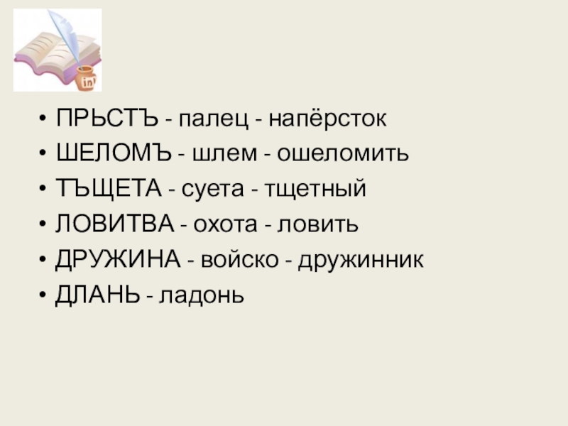 по-старославянски. Попробуйте их перевести на современный русский язык. Подберите к ним родственные слова, которые используются в наши дни: