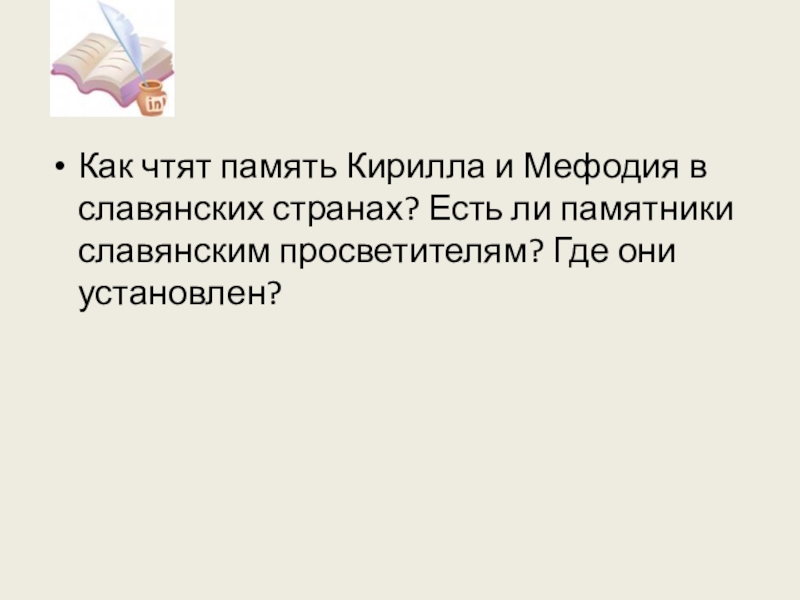 Слайд 19Как чтят память Кирилла и Мефодия в славянских странах? Есть ли