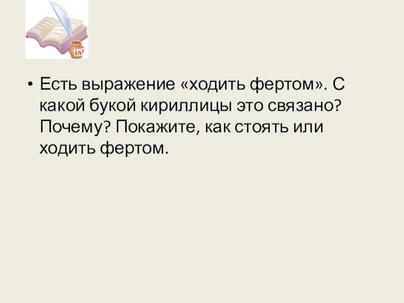 Слайд 17Есть выражение «ходить фертом». С какой букой кириллицы это связано? Почему?