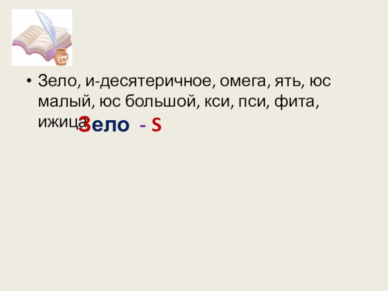 Слайд 11Зело, и-десятеричное, омега, ять, юс малый, юс большой, кси, пси, фита,