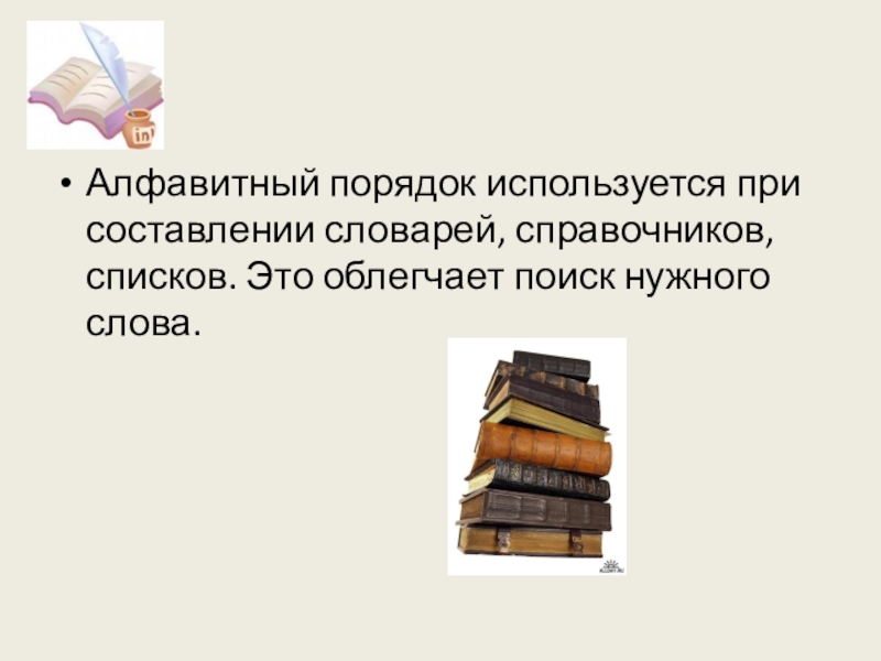 Слайд 8Алфавитный порядок используется при составлении словарей, справочников, списков. Это облегчает поиск