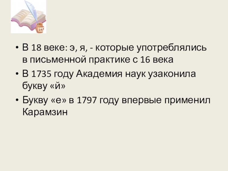 Слайд 13В 18 веке: э, я, - которые употреблялись в письменной практике