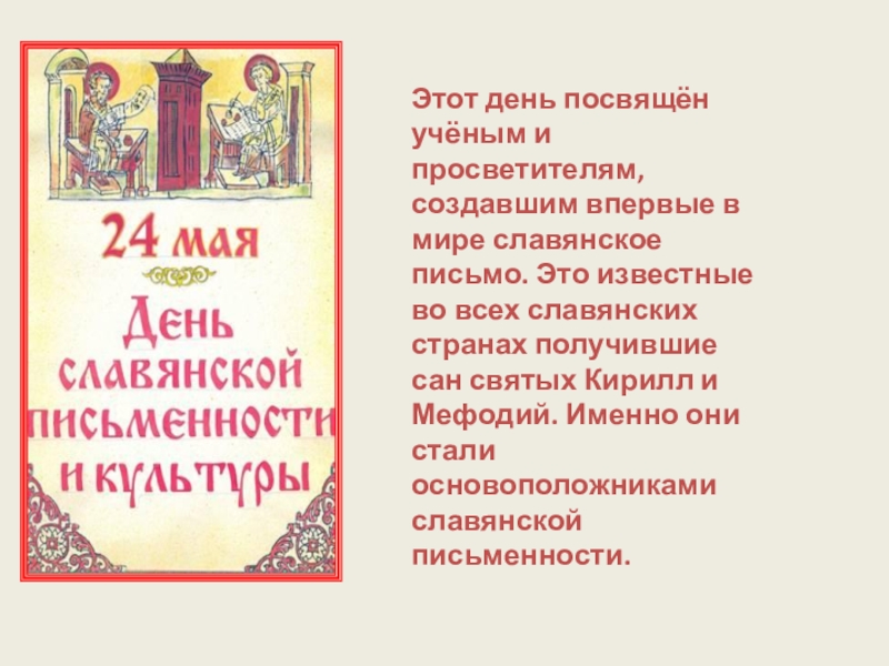 Слайд 20Этот день посвящён учёным и просветителям, создавшим впервые в мире славянское