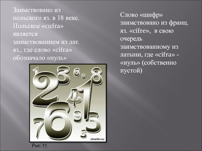 Слово «шифр» заимствовано из франц. яз. «cifre», в свою очередь заимствованному из латыни, где «cifra» - «нуль» (собственно пустой)