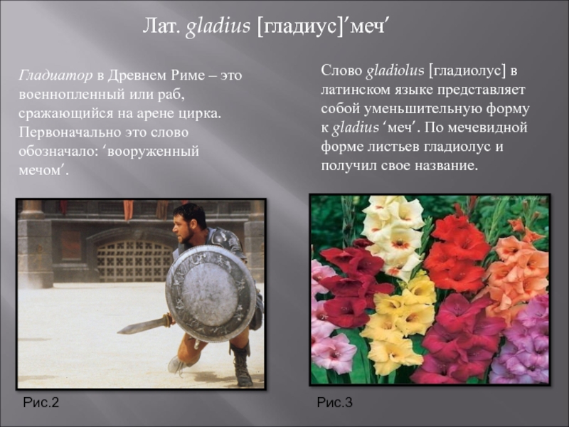Слово gladiolus [гладиолус] в латинском языке представляет собой уменьшительную форму к gladius ‘меч’. По мечевидной форме листьев гладиолус и получил свое название.