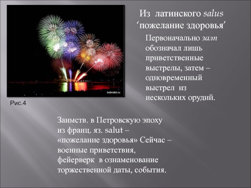 Заимств. в Петровскую эпоху из франц. яз. salut – «пожелание здоровья» Сейчас – военные приветствия, фейерверк в ознаменование торжественной даты, события.