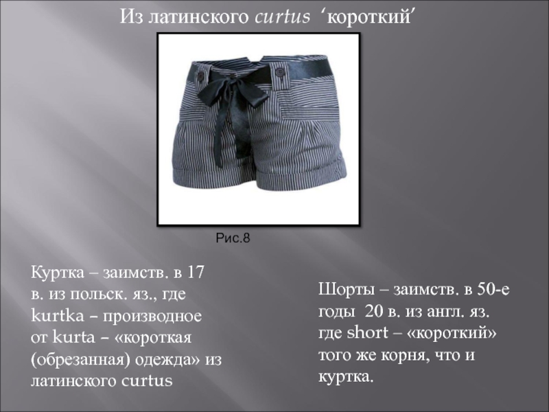Шорты – заимств. в 50-е годы 20 в. из англ. яз. где short – «короткий» того же корня, что и куртка.
