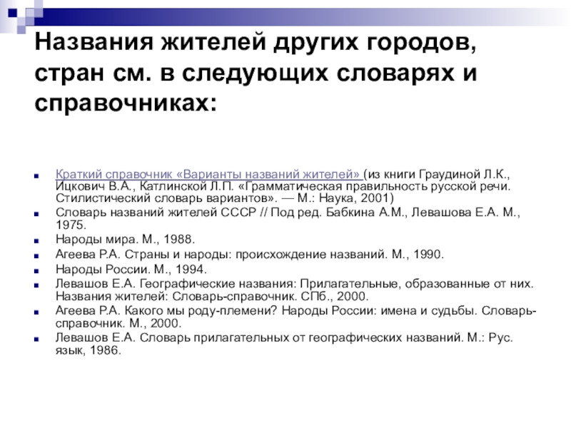 справочник «Варианты названий жителей» (из книги Граудиной Л.К., Ицкович В.А., Катлинской Л.П. «Грамматическая правильность русской речи. Стилистический словарь вариантов». — М.: Наука, 2001)