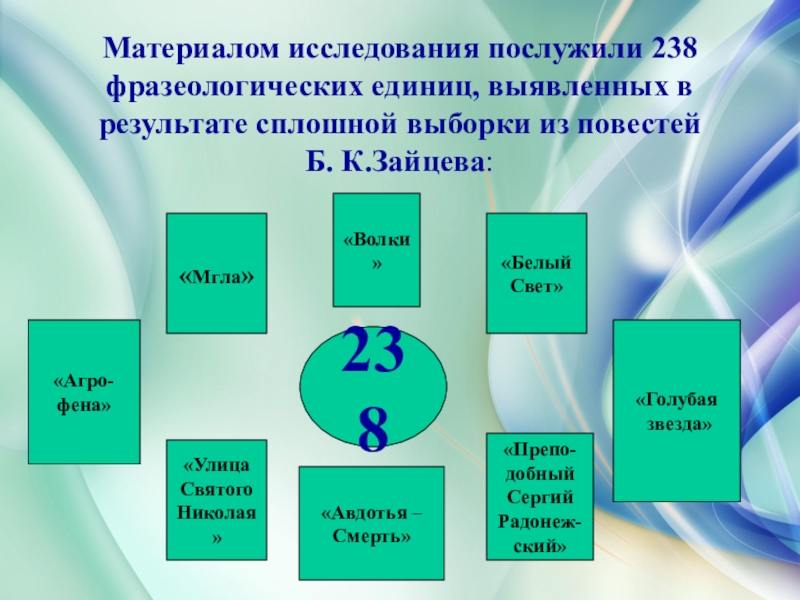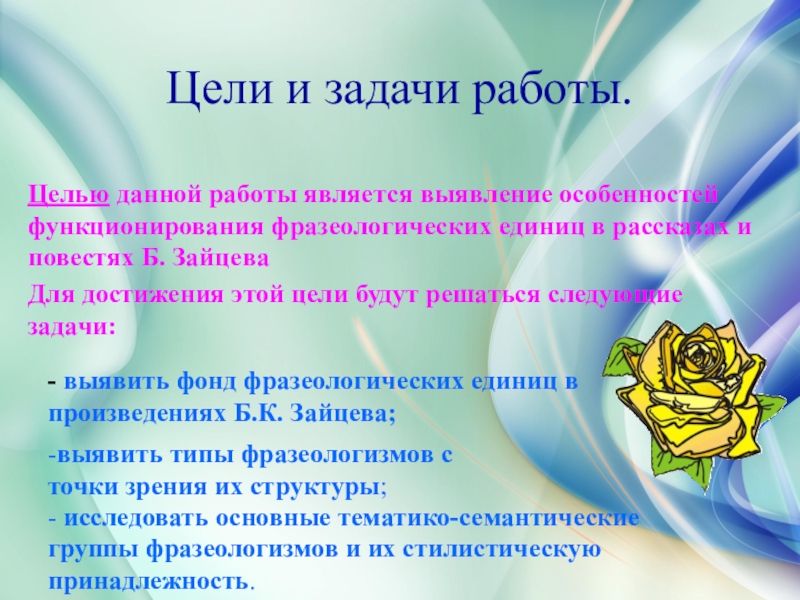 - выявить фонд фразеологических единиц в произведениях Б.К. Зайцева;