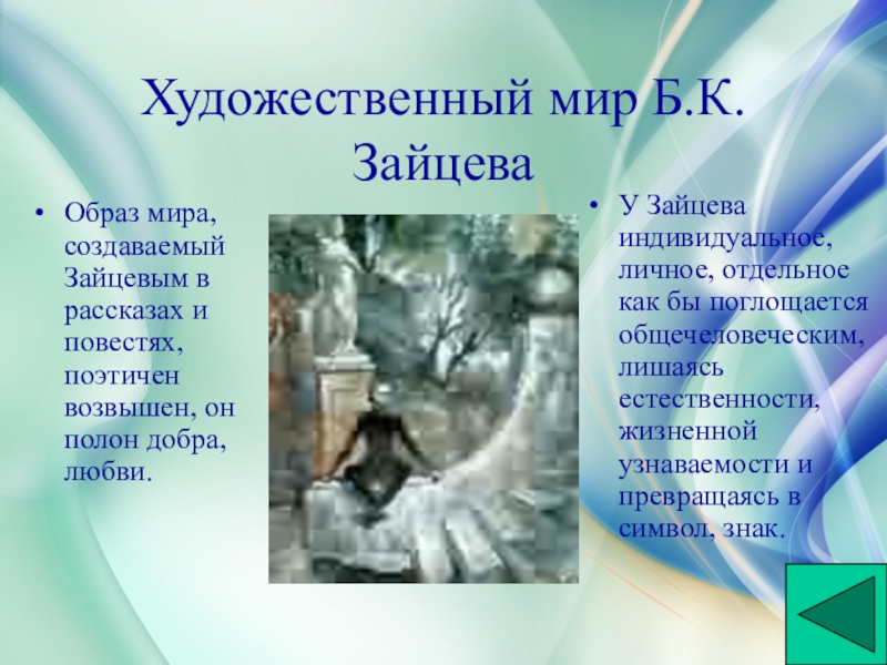 У Зайцева индивидуальное, личное, отдельное как бы поглощается общечеловеческим, лишаясь естественности, жизненной узнаваемости и превращаясь в символ, знак.