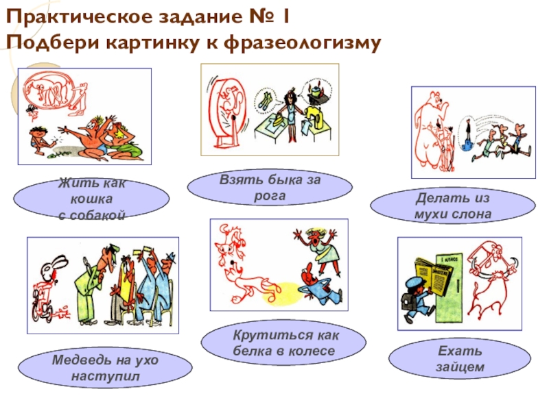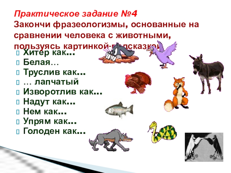 Закончи фразеологизмы, основанные на сравнении человека с животными, пользуясь картинкой-подсказкой