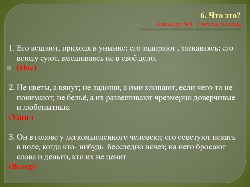3. Он в голове у легкомысленного человека; его советуют искать в поле, когда кто- нибудь бесследно исчез; на него бросают слова и деньги, кто их не ценит