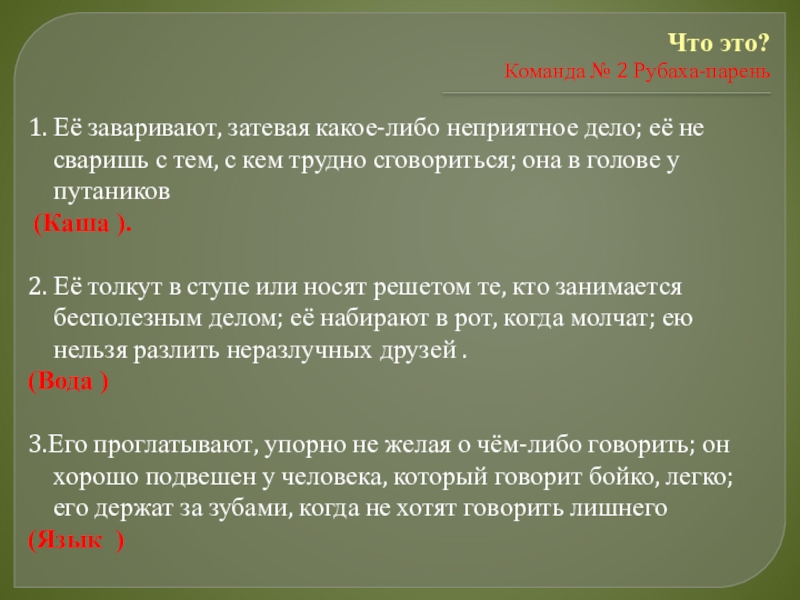 2. Её толкут в ступе или носят решетом те, кто занимается бесполезным делом; её набирают в рот, когда молчат; ею нельзя разлить неразлучных друзей .