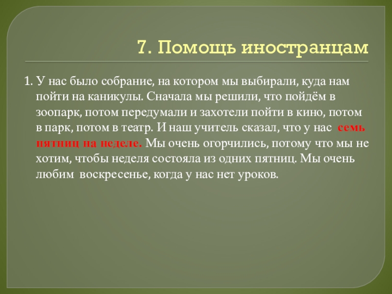 куда нам пойти на каникулы. Сначала мы решили, что пойдём в зоопарк, потом передумали и захотели пойти в кино, потом в парк, потом в театр. И наш учитель сказал, что у нас семь пятниц на неделе. Мы очень огорчились, потому что мы не хотим, чтобы неделя состояла из одних пятниц. Мы очень любим воскресенье, когда у нас нет уроков.