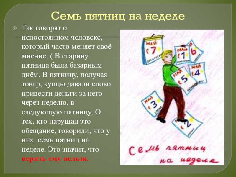 своё мнение. ( В старину пятница была базарным днём. В пятницу, получая товар, купцы давали слово привести деньги за него через неделю, в следующую пятницу. О тех, кто нарушал это обещание, говорили, что у них семь пятниц на неделе. Это значит, что верить ему нельзя.