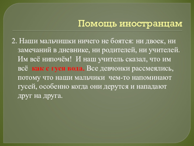 в дневнике, ни родителей, ни учителей. Им всё нипочём! И наш учитель сказал, что им всё как с гуся вода. Все девчонки рассмеялись, потому что наши мальчики чем-то напоминают гусей, особенно когда они дерутся и нападают друг на друга.