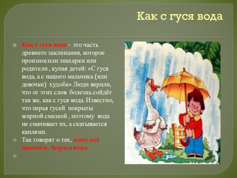 заклинания, которое произносили знахарки или родители , купая детей: «С гуся вода, а с нашего мальчика (или девочки) худоба» Люди верили, что от этих слов болезнь сойдёт так же, как с гуся вода. Известно, что перья гусей покрыты жирной смазкой , поэтому вода не смачивает их, а скатывается каплями.