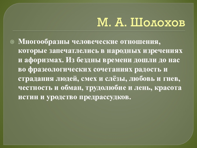 афоризмах. Из бездны времени дошли до нас во фразеологических сочетаниях радость и страдания людей, смех и слёзы, любовь и гнев, честность и обман, трудолюбие и лень, красота истин и уродство предрассудков.