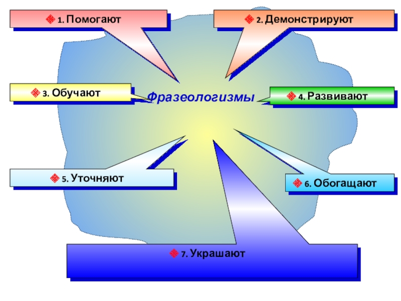 1. Помогают 2. Демонстрируют 3. Обучают 4. Развивают 5. Уточняют 7. Украшают 6. Обогащают