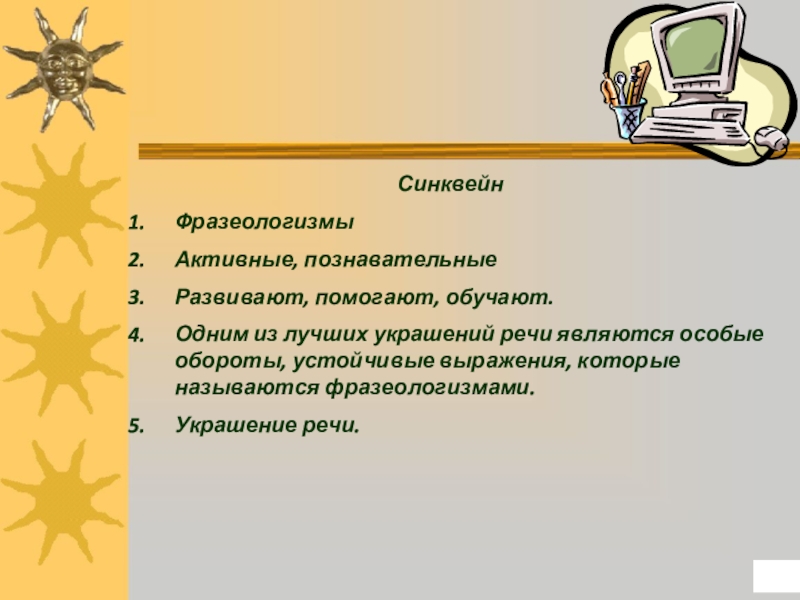СинквейнФразеологизмыАктивные, познавательныеРазвивают, помогают, обучают.Одним из лучших украшений речи являются особые обороты, устойчивые выражения, которые называются фразеологизмами.Украшение речи.