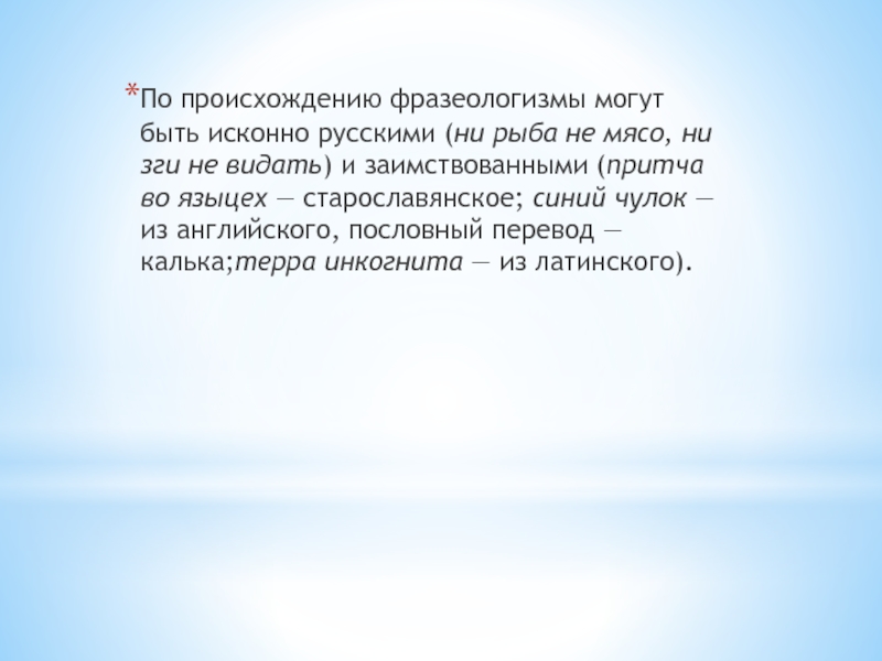 ни зги не видать) и заимствованными (притча во языцех — старославянское; синий чулок — из английского, пословный перевод — калька;терра инкогнита — из латинского).