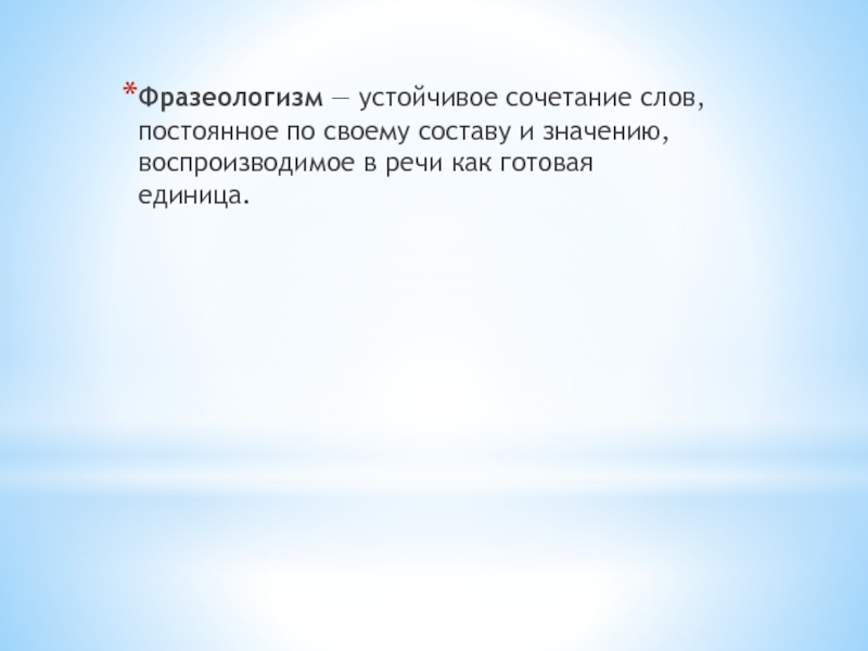 Фразеологизм — устойчивое сочетание слов, постоянное по своему составу и значению, воспроизводимое в речи как готовая единица.