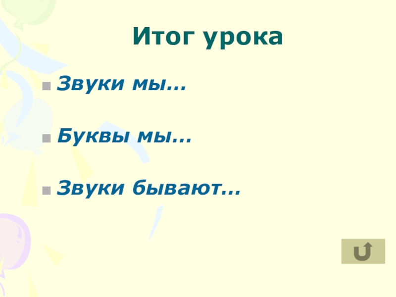 Итог урокаЗвуки мы…Буквы мы…Звуки бывают…