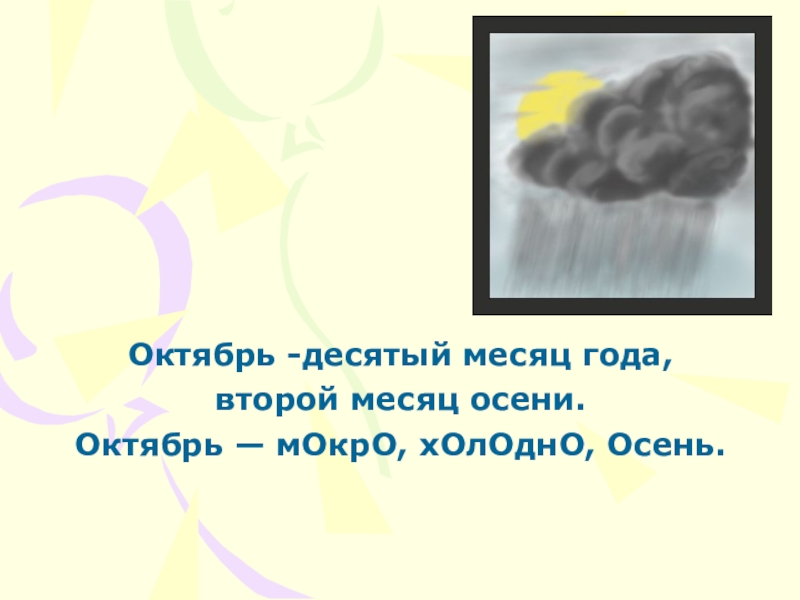 Октябрь -десятый месяц года, второй месяц осени.Октябрь — мОкрО, хОлОднО, Осень.