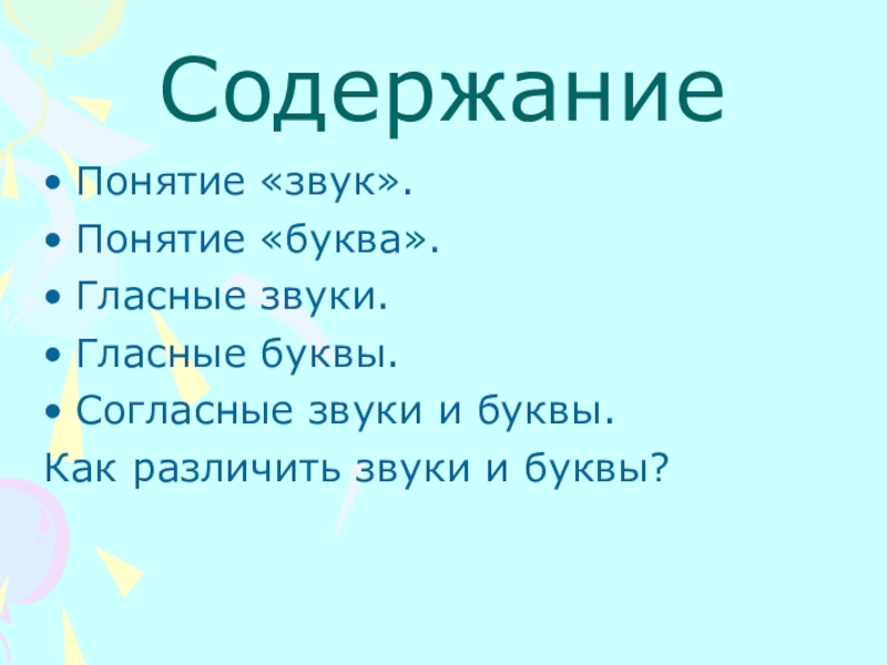 СодержаниеПонятие «звук».Понятие «буква».Гласные звуки.Гласные буквы.Согласные звуки и буквы.Как различить звуки и буквы?