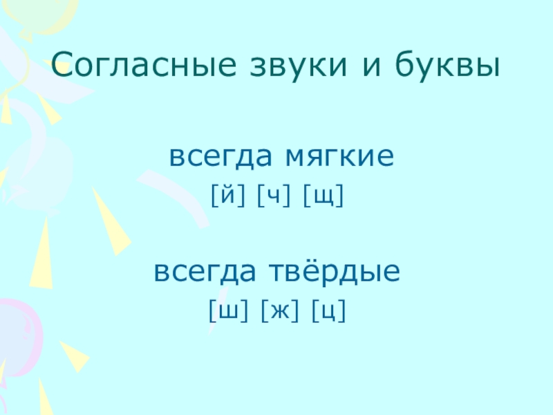 Согласные звуки и буквы всегда мягкие[й] [ч] [щ]всегда твёрдые[ш] [ж] [ц]