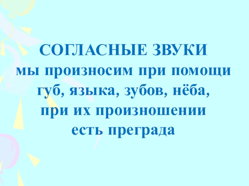 СОГЛАСНЫЕ ЗВУКИмы произносим при помощигуб, языка, зубов, нёба,при их произношенииесть преграда