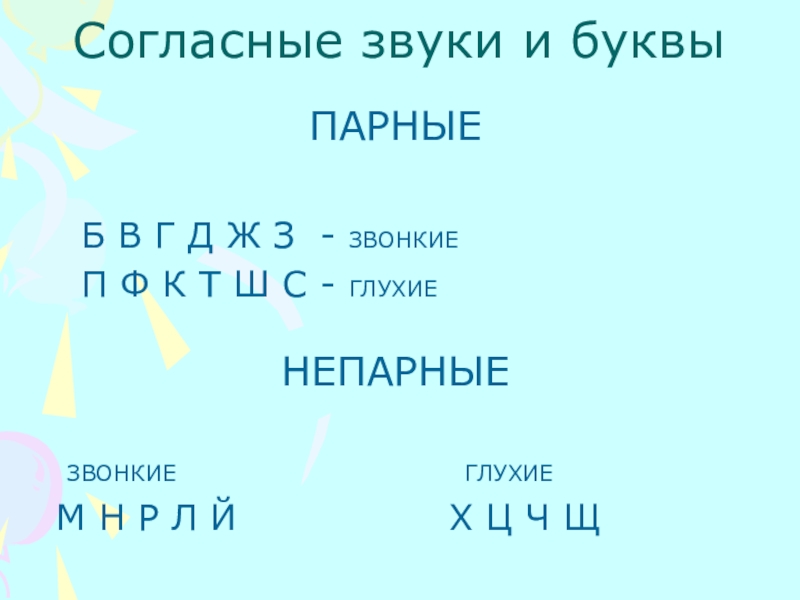 Согласные звуки и буквы ПАРНЫЕ  Б В Г Д Ж З - ЗВОНКИЕ  П Ф