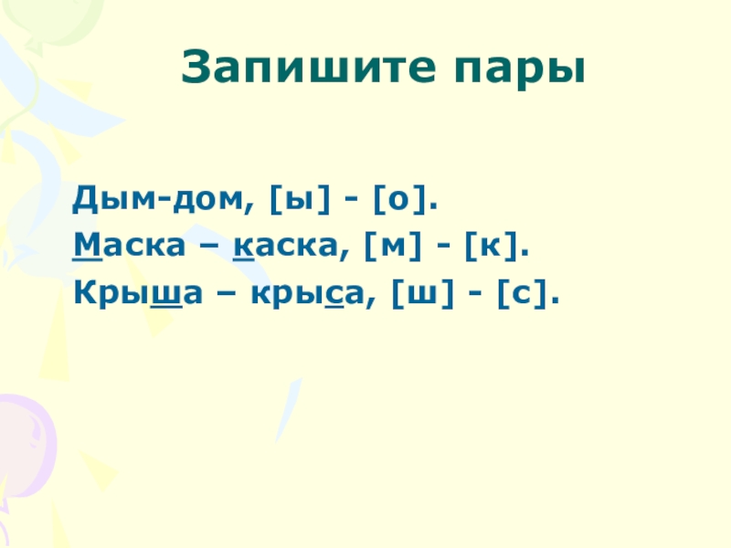 Запишите пары Дым-дом, [ы] - [о].Маска – каска, [м] - [к].Крыша – крыса, [ш] - [с].