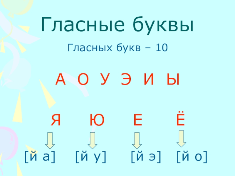 Гласные буквыГласных букв – 10А О У Э И Ы Я   Ю   Е