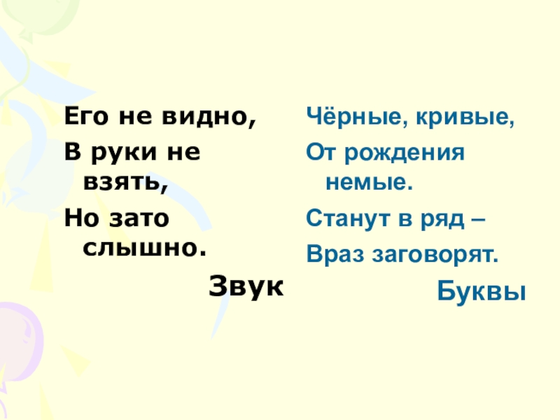 Его не видно,В руки не взять,Но зато слышно.Звук Чёрные, кривые,От рождения немые.Станут в ряд –Враз заговорят.Буквы